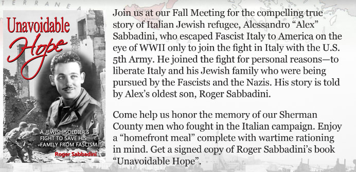 Join The Sherman County Historical Society at their Fall Meeting for the compelling true story of Italian Jewish refugee, Alessandro “Alex” Sabbadini, who escaped Fascist Italy to America on the eye of WWII only to join the fight in Italy with the U.S. 5th Army. He joined the fight for personal reasons—to liberate Italy and his Jewish family who were being pursued by the Fascists and the Nazis. His story is told by Alex’s oldest son, Roger Sabbadini. Come help us honor the memory of our Sherman County men who fought in the Italian campaign. Enjoy a “homefront meal” complete with wartime rationing in mind. Get a signed copy of Roger Sabbadini’s book “Unavoidable Hope”.