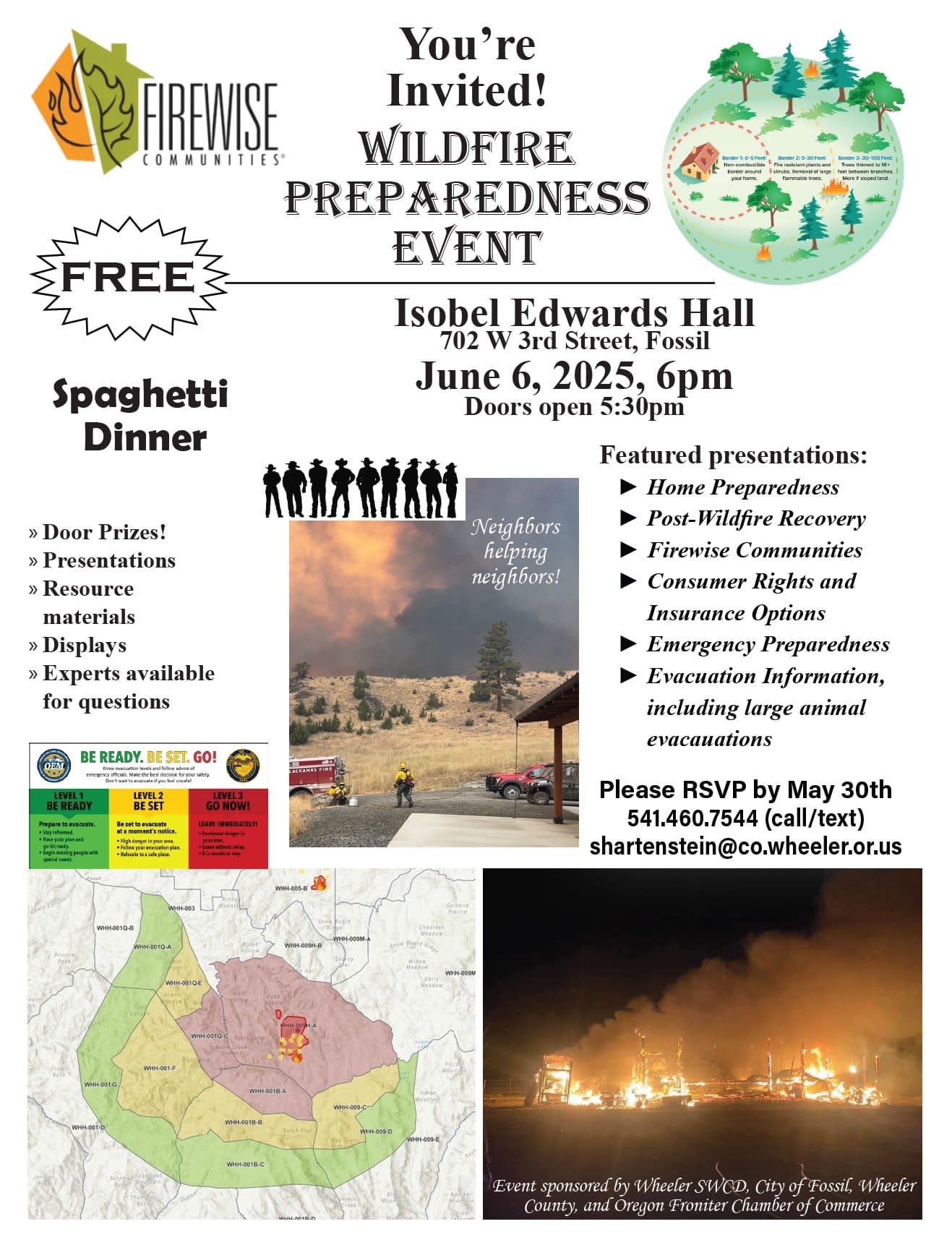 Come and join us in Fossil for a Wildfire Preparedness evening! Free spaghetti dinner and lots of great door prizes! We have lots of great speakers and regional resources planned to join us at this event. Community members from Fossil, Mitchell, Spray and Condon are welcome!