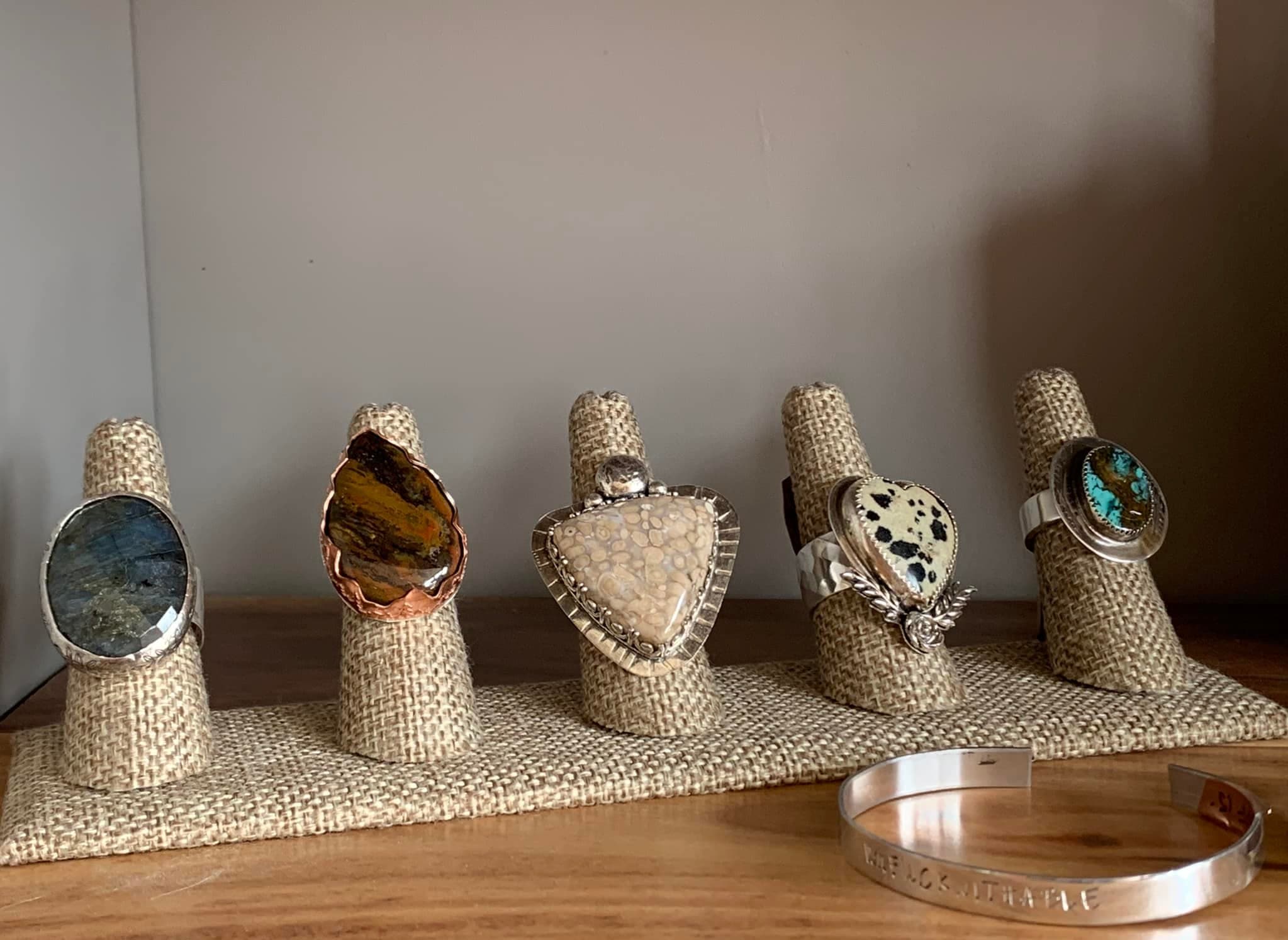 Hand stamped silver jewelry, and plants.
